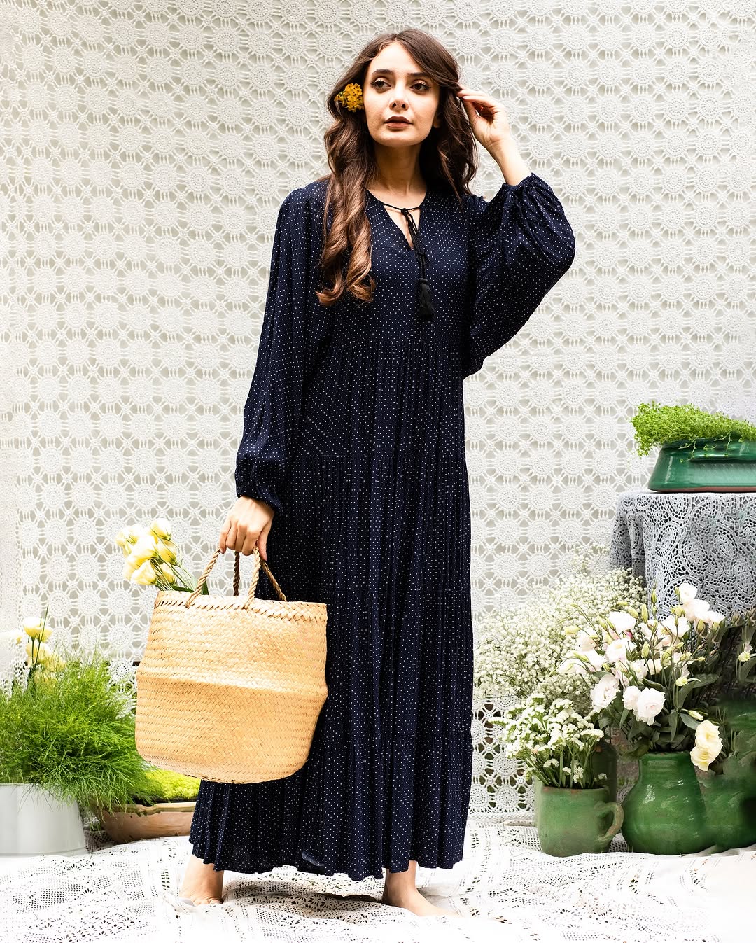 پیراهن بلند نخی فری سایز خالخالی، زمینه سورمه ای با خال ریز سفید