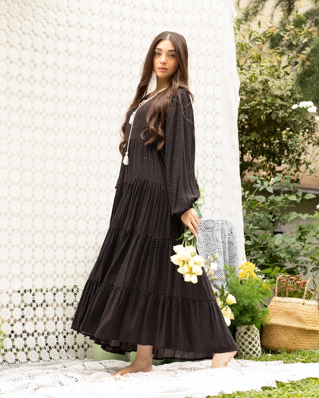 پیراهن بلند نخی فری سایز خالخالی، زمینه مشکی با خال ریز سفید