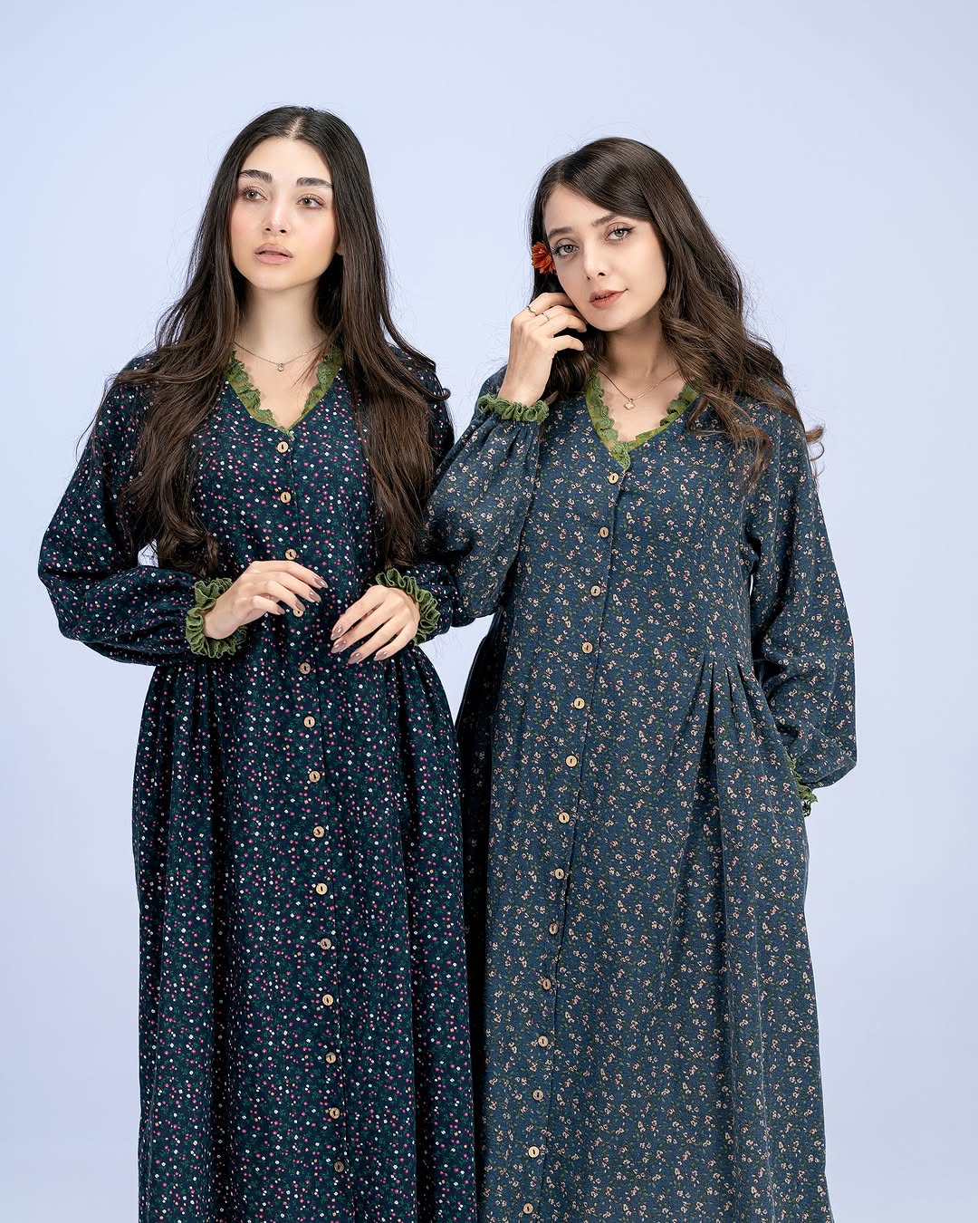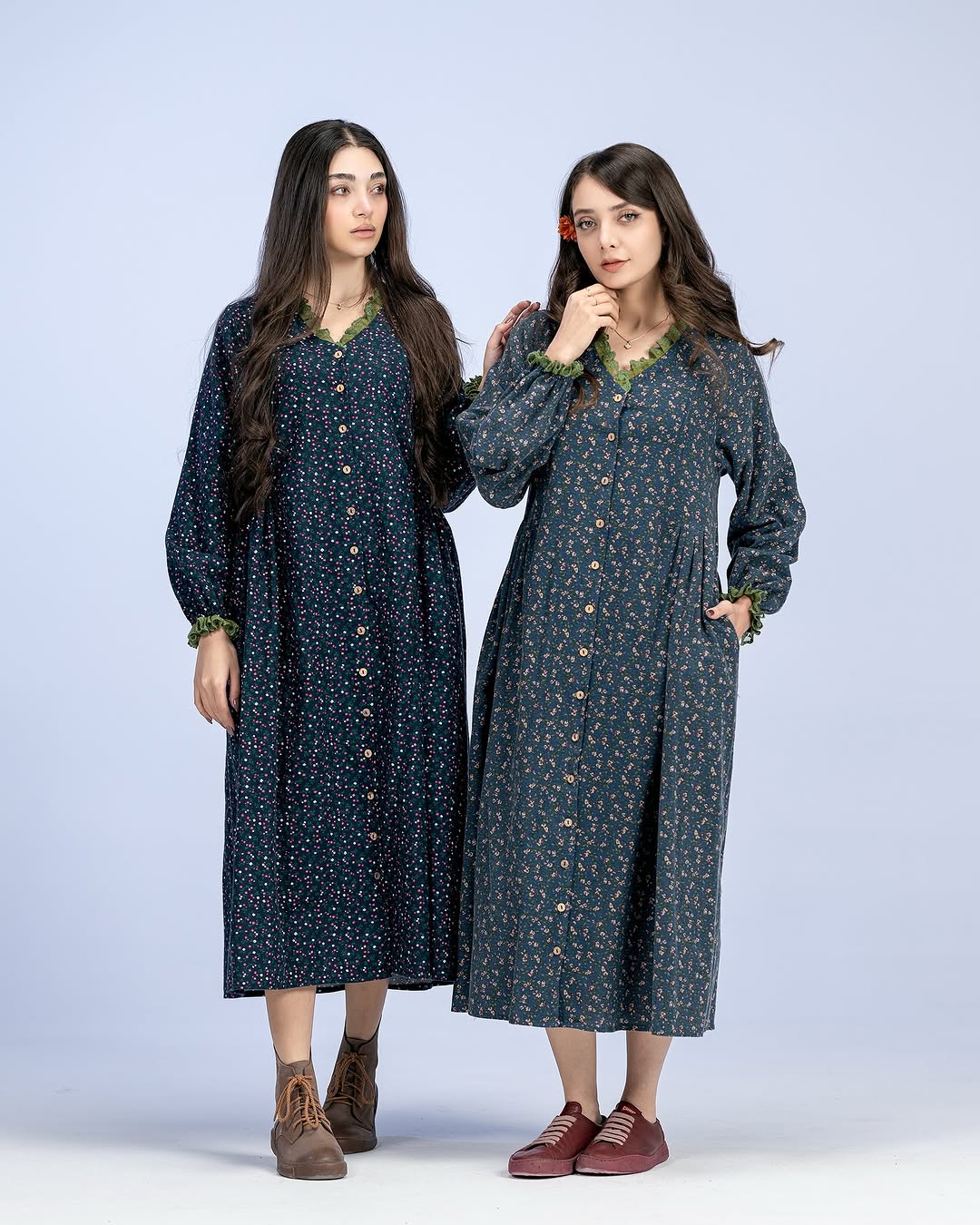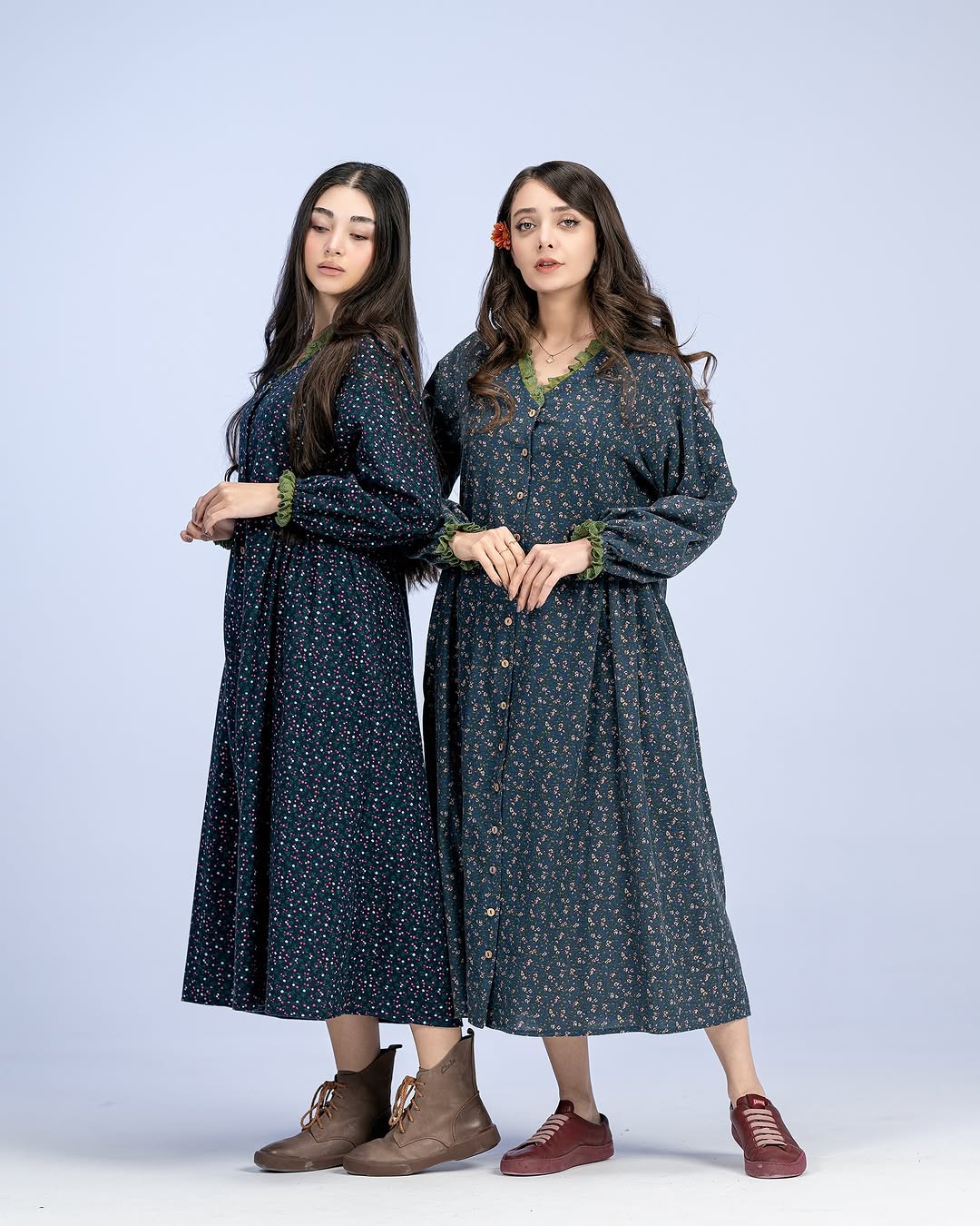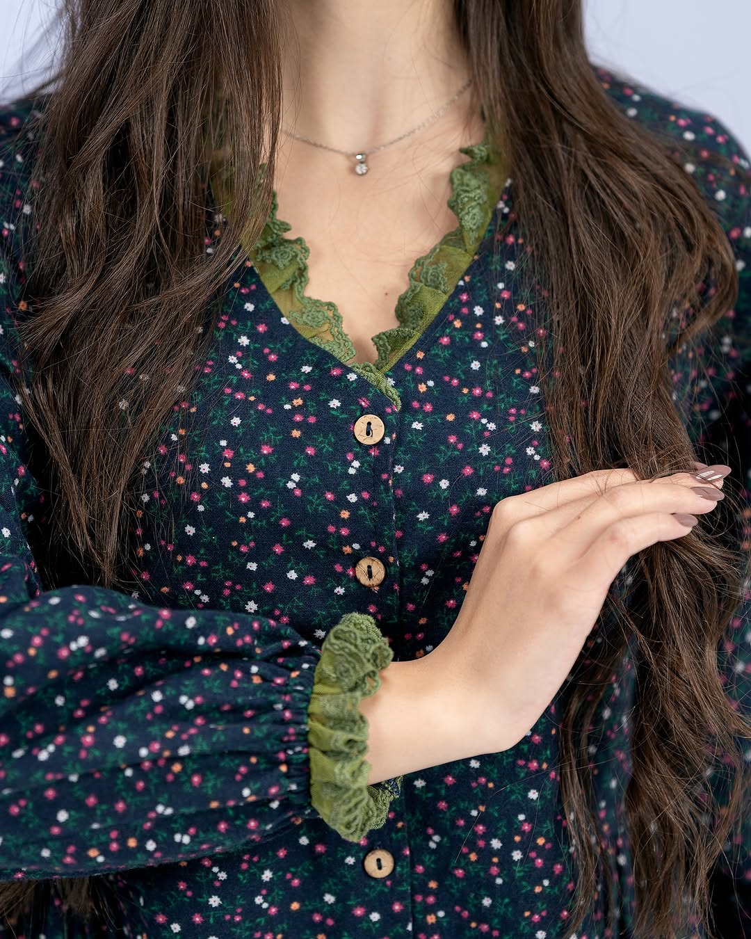 پیراهن لینن کرکدار گل ریز سورمه ای کد ۲۷۵