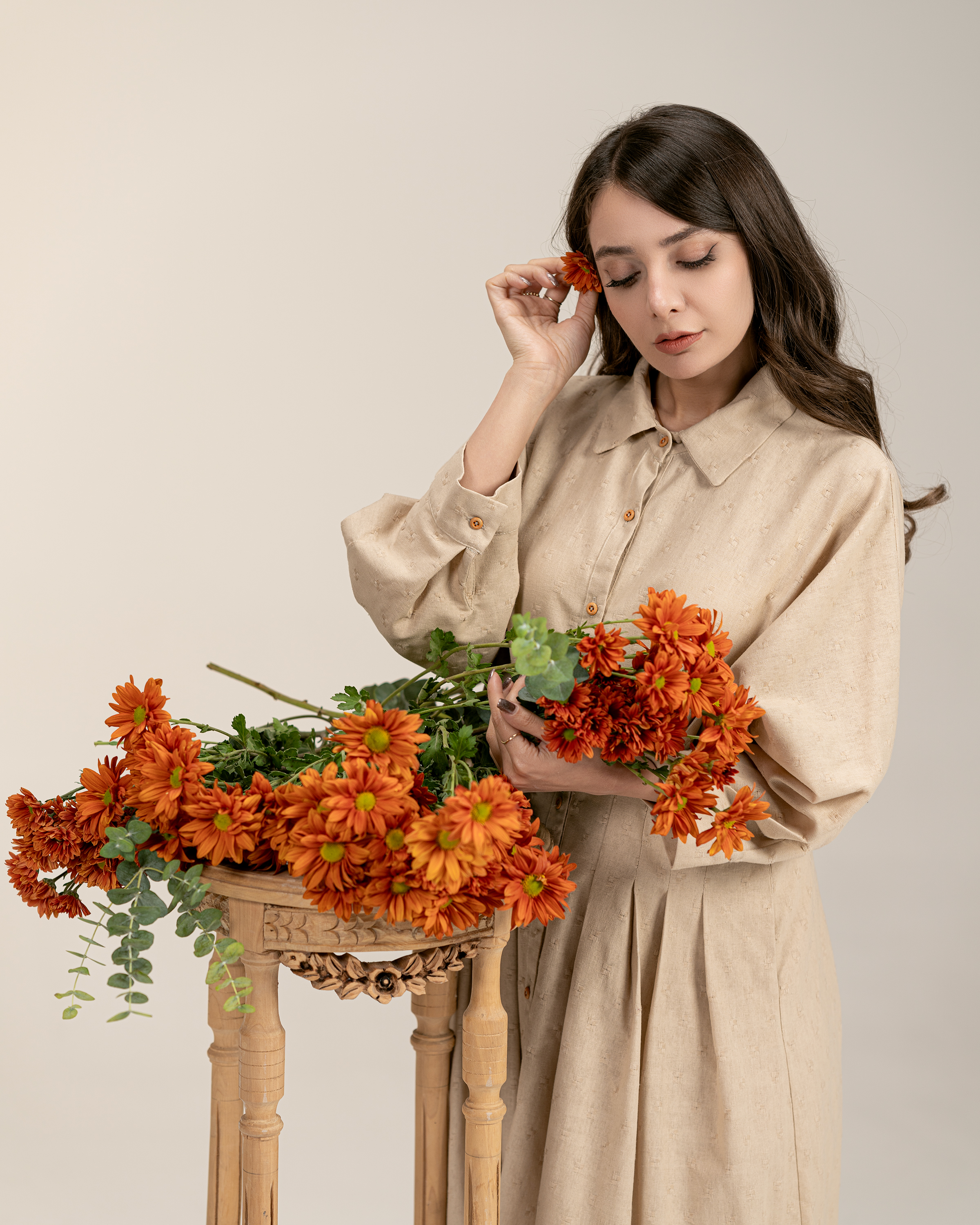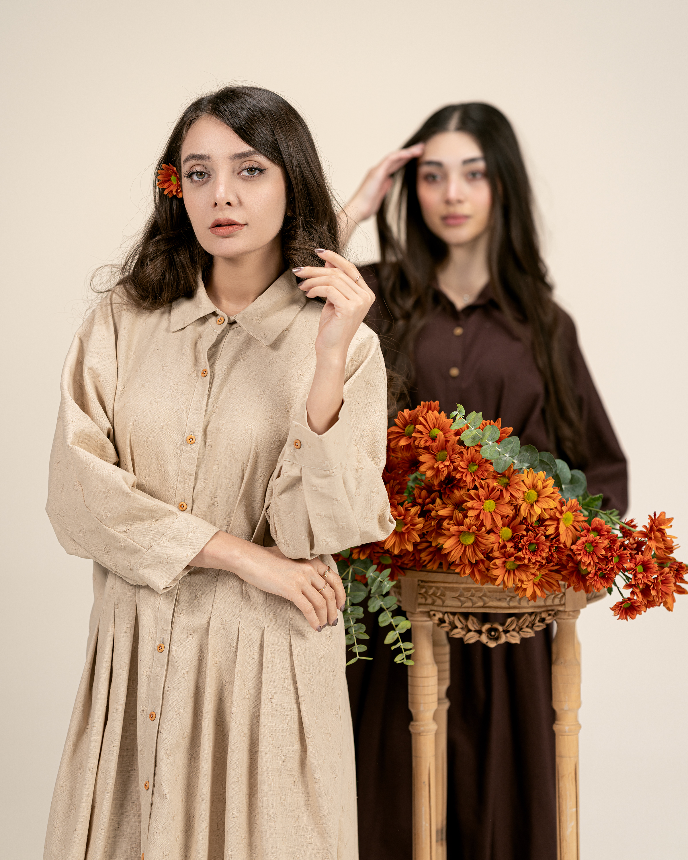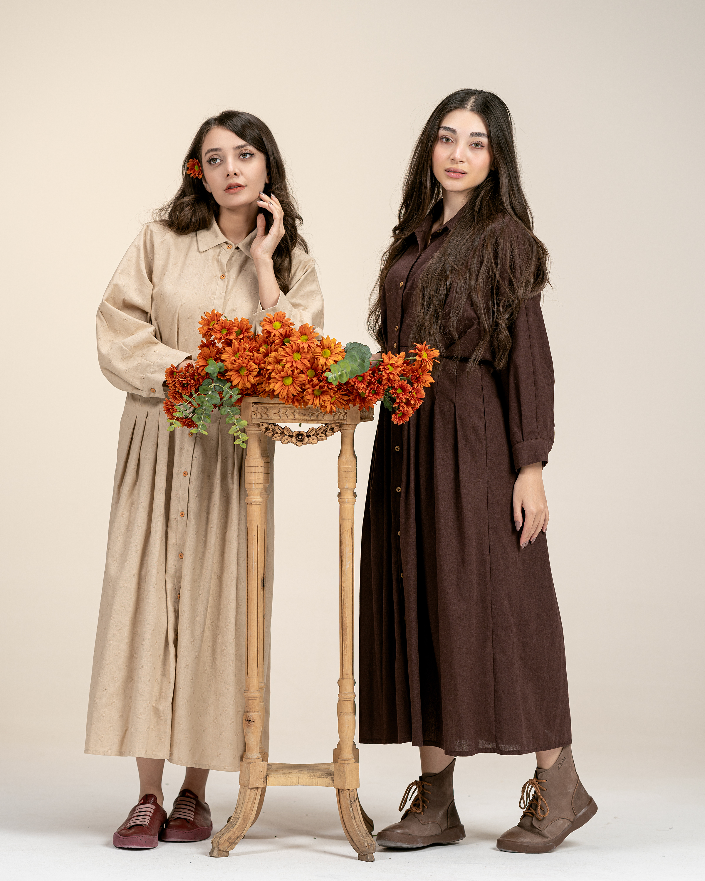 پیراهن بلند تک رنگ لینن . رنگ قهوه ای و کرم