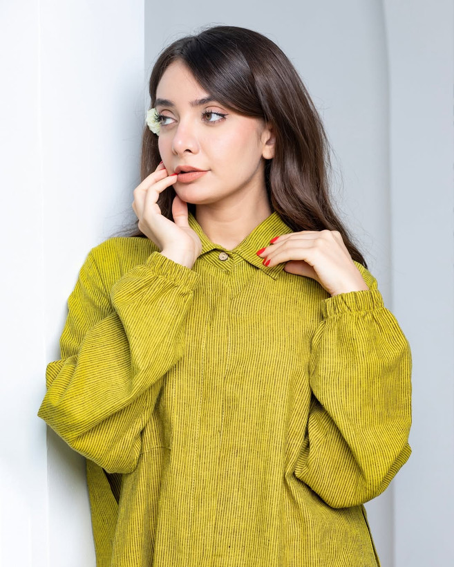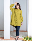 شومیز لینن با سایزبندی فری مناسب تا دور سینه ۱۱۲ سانتیمتر. قد شومیز در قسمت جلو ۷۸ و در قسمت پشت ۸۲ سانتیمتر. رنگ بندی: دو رنگ، راه راه سبز و راه راه زرد.
