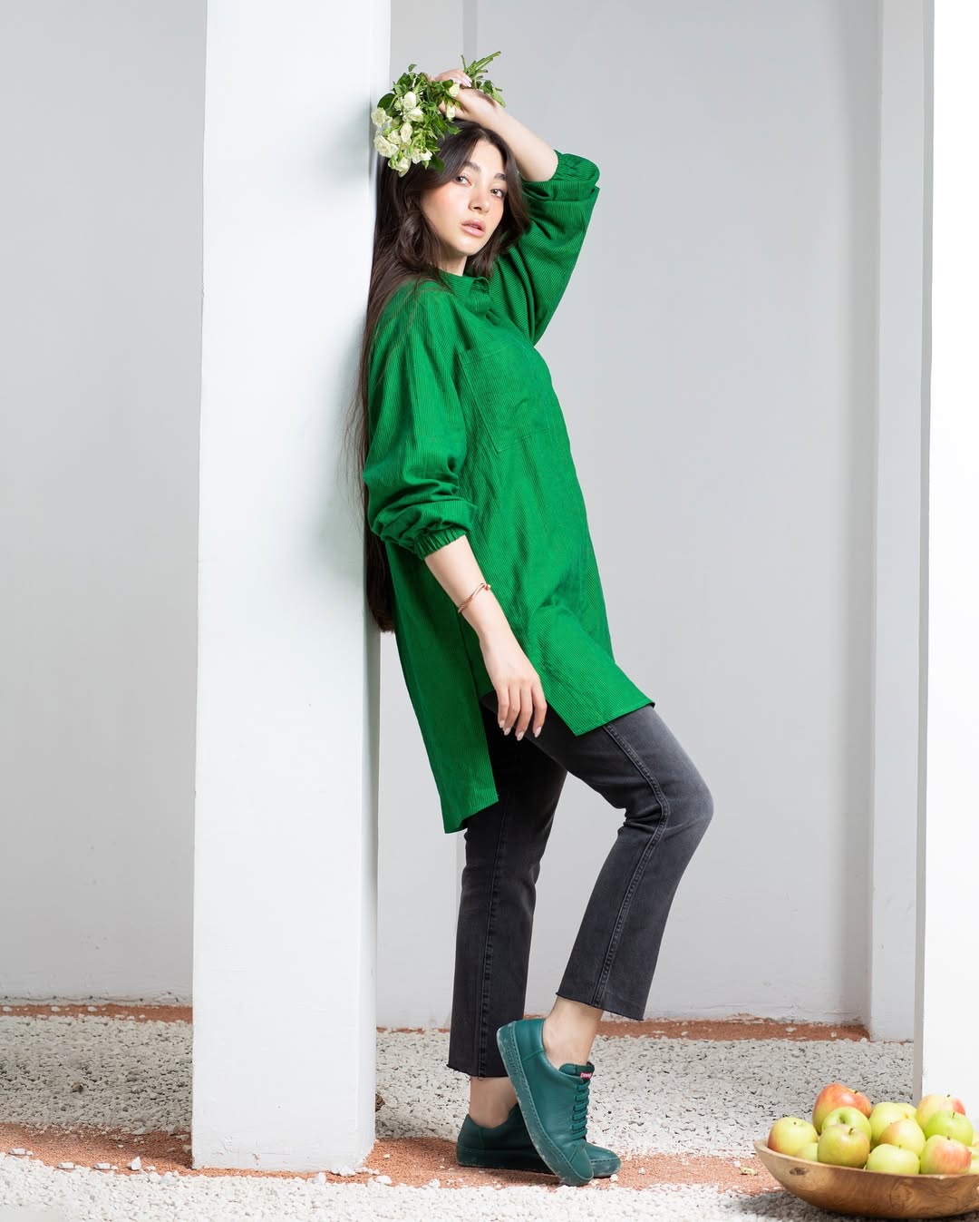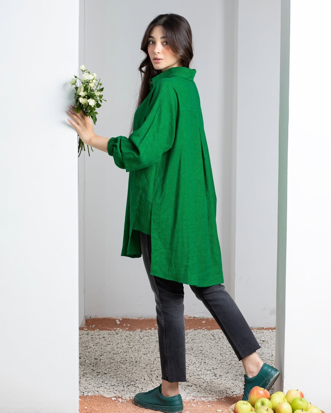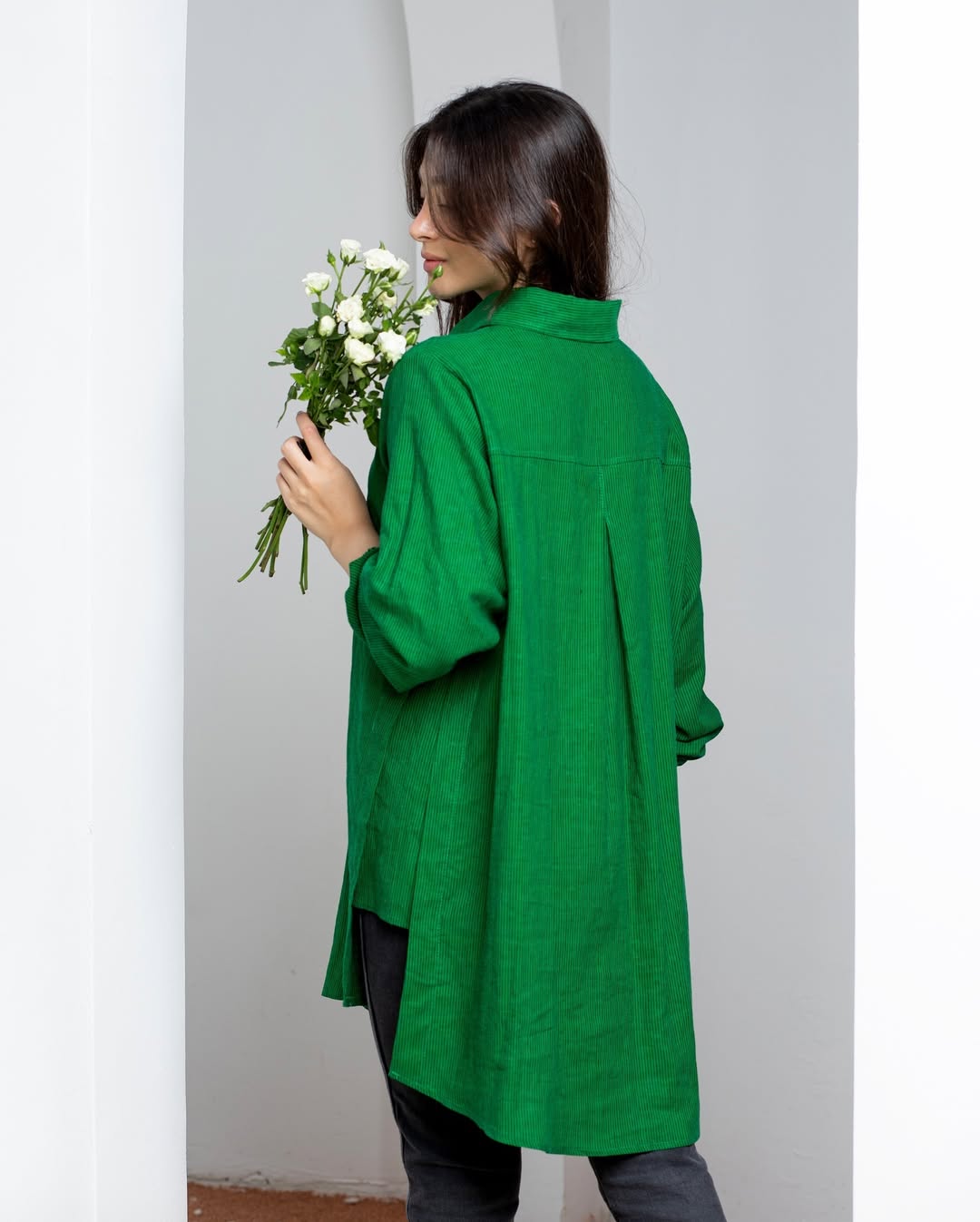 شومیز لینن فری سایز راه راه ریز سبز