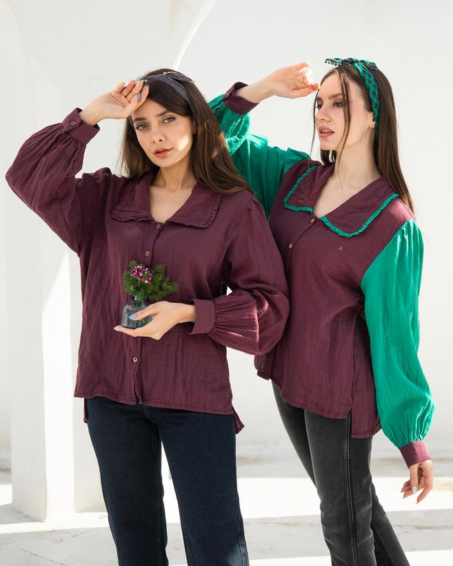 این شومیز از جنس لینن وارداتی با قد جلو ۶۲ سانتیمتر و قد پشت ۶۸ سانتیمتر است. مناسب برای دور سینه تا ۱۰۰ سانتیمتر (سایز ۳۶ تا ۴۰) و ۱۱۰ سانتیمتر (سایز ۴۲ تا ۴۶) میباشد. رنگ بندی شامل زرشکی، سبز، آبی و ترکیبهای رنگی است.