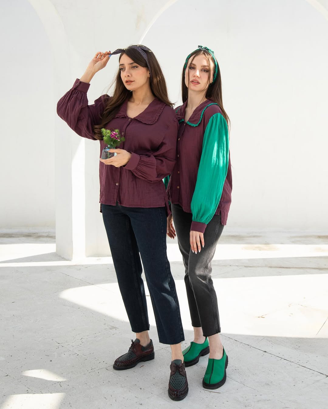 این شومیز از جنس لینن وارداتی با قد جلو ۶۲ سانتیمتر و قد پشت ۶۸ سانتیمتر است. مناسب برای دور سینه تا ۱۰۰ سانتیمتر (سایز ۳۶ تا ۴۰) و ۱۱۰ سانتیمتر (سایز ۴۲ تا ۴۶) میباشد. رنگ بندی شامل زرشکی، سبز، آبی و ترکیبهای رنگی است.