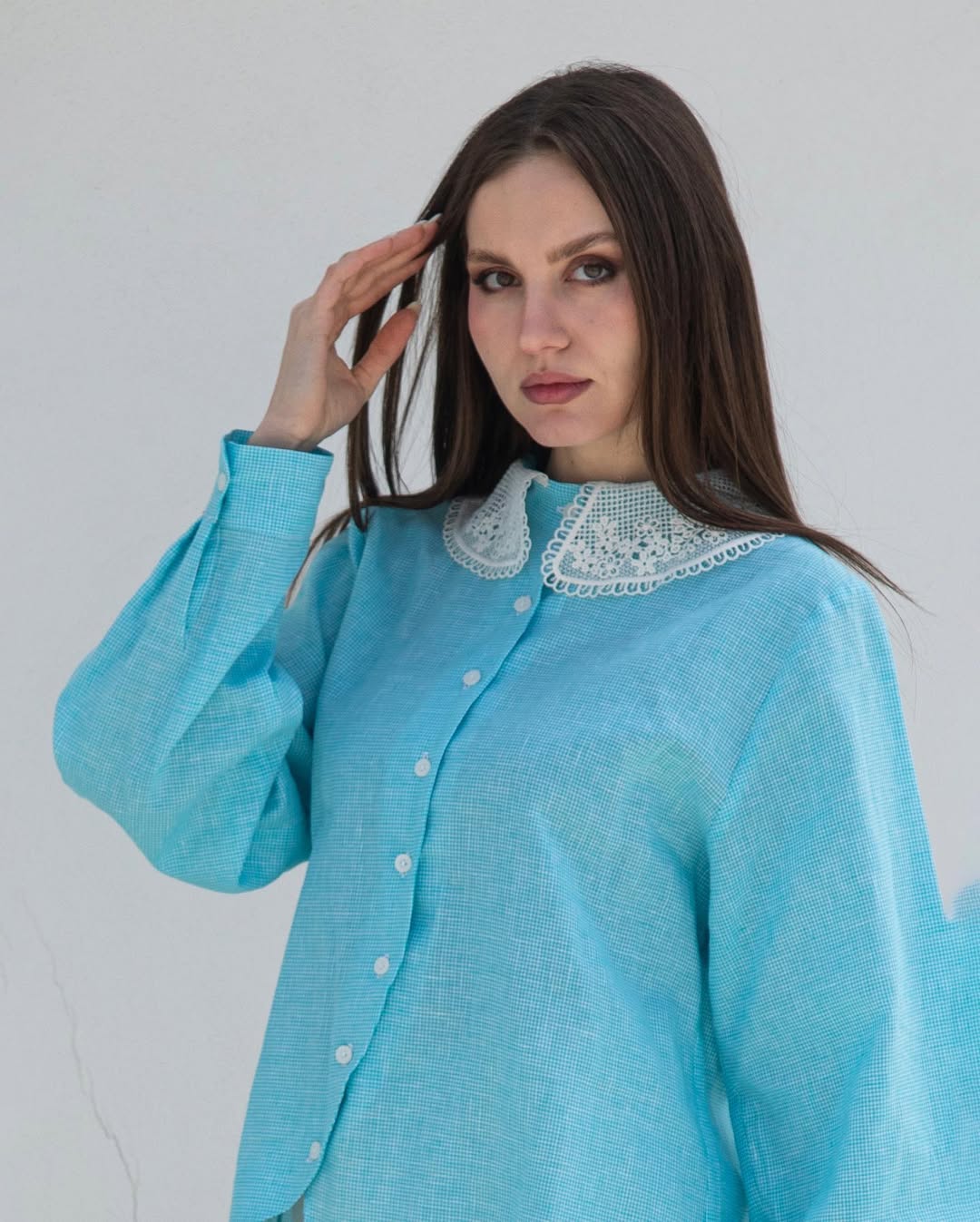 شومیز خنک با جنس لینن وارداتی، مناسب برای دور سینه ۱۰۰ تا ۱۱۰ سانتیمتر، قد جلو ۶۲ و قد پشت ۶۵ سانتیمتر. رنگ بندی: چهارخونه ریز آبی و سفید، آجری با خط های ظریف کرم.
