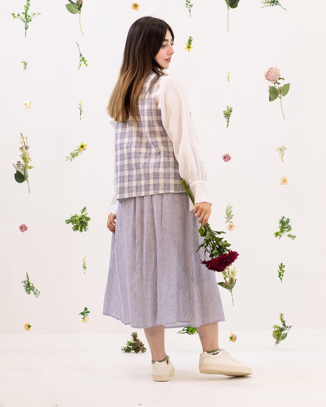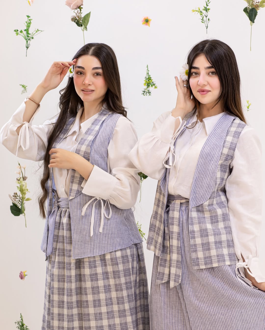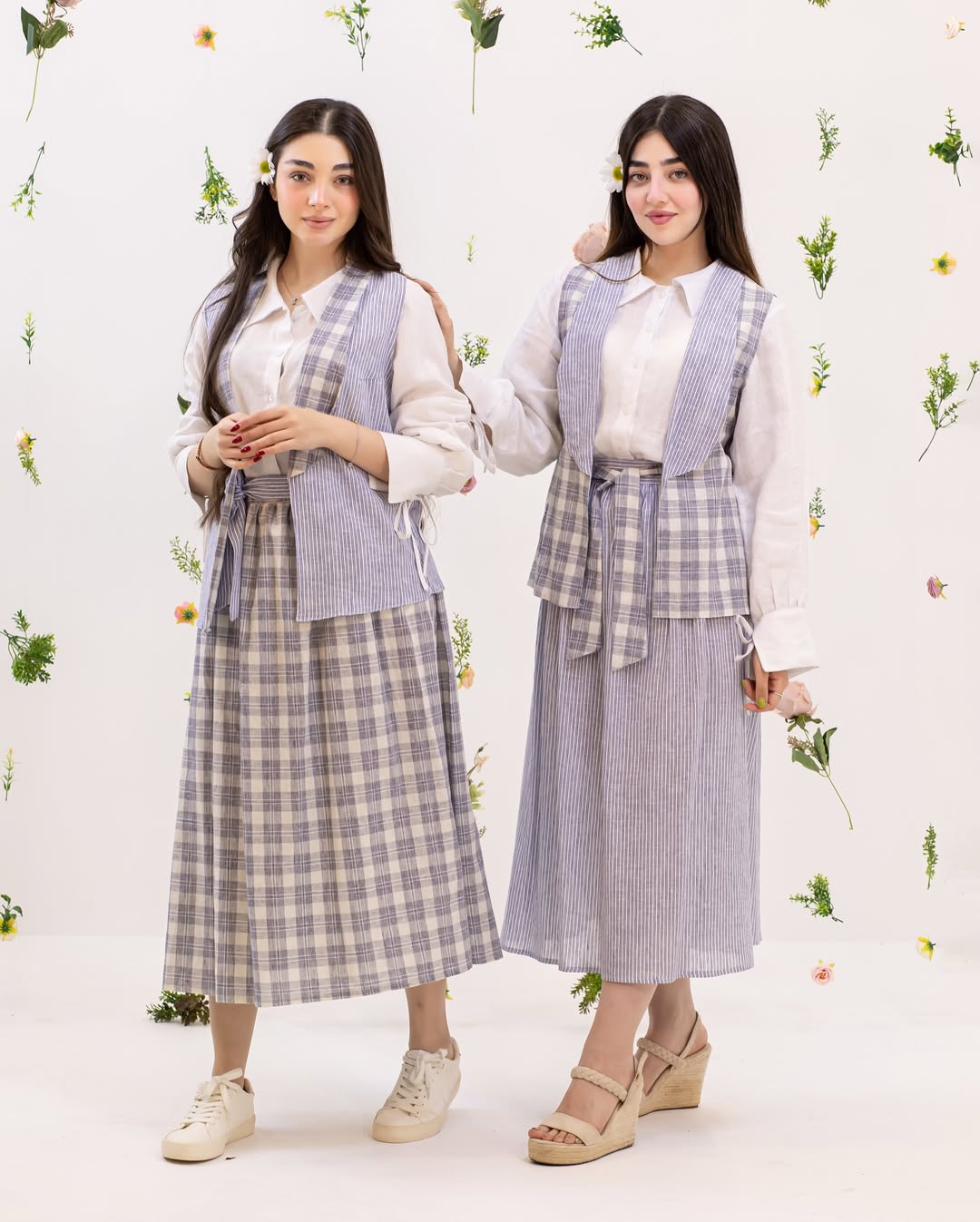 ست شامل وست و دامن از جنس لینن با سایزبندی مناسب. وست فری سایز تا دور سینه ۱۱۰ سانتیمتر و دامن فری سایز تا دور باسن ۱۱۰ سانتیمتر. دامن با کش در پشت و قد ۸۰ سانتیمتر.